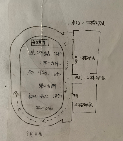9月方案:复旦初级中学预备年级班主任组织教室学习广播操、室内操。复旦中学高三年级第一方阵,复旦初级中学初一年级第二方阵,复旦初级中学初三年级和初二年级第三方阵。