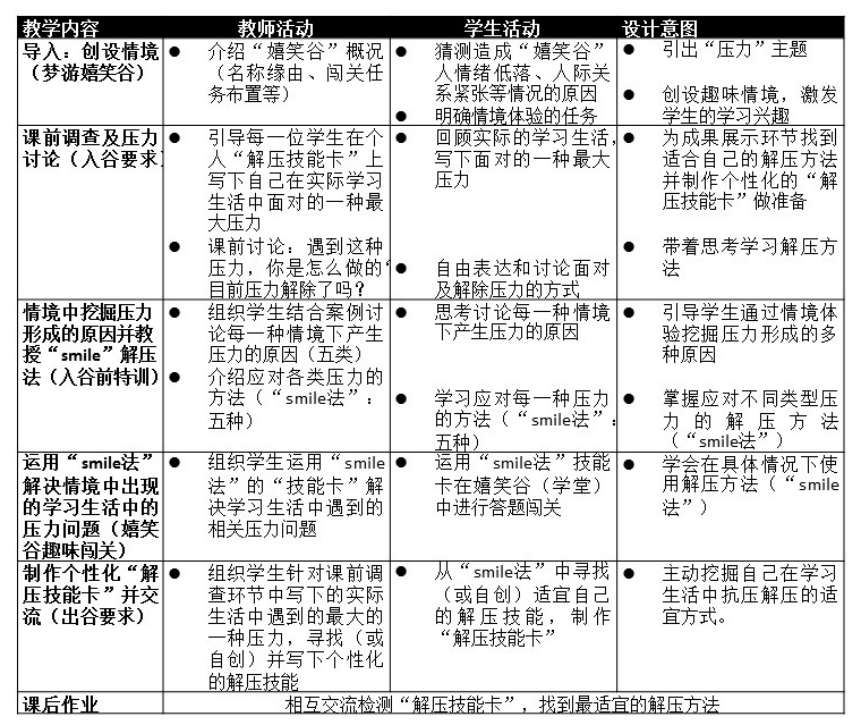 对此,笔者根据“对应性”,就每一步过程及要达到的分目标创设了每一幕较为合适的情境:介绍“嬉笑谷”概况:猜测造成“嬉笑谷”人情绪低落、人际关系紧张等情况的原因(引出压力)——嬉笑谷谷长介绍入谷要求:入谷前,请真实写下自己在“真实世界”中面对的最大的一种压力是什么等(课前大讨论)——入谷前的特训:根据嬉笑谷·学堂中的闯关案例对学生进行训练指导(了解不同压力的类型,如何以smile法解压)——嬉笑谷·学堂趣味闯关:分组运用smile技能卡抢答闯关(对smile解压方法进行实际情景的运用)——出谷要求:找到消除个人最大压力的方法并制作“解压技能卡”(提出方案解决自己的实际压力)。