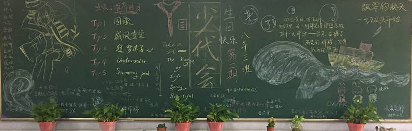 初二(1)中队以“少年强则国强——happy birthday”为主题,细致地介绍了少先队的由来和红领巾、星星火炬葆有的深入含义,帮助队员增强属于少先队员这一身份的光荣感,将队员志向与国家发展的重任联系在一起,引导队员以国之发展而立志,以国之发展而担当。正如习总书记于2015年6月在中国少年先锋队第七次全国代表大会上强调的,一个人可以有很多志向,但人生最重要的志向应该同祖国和人民联系在一起,这是人们各种具体志向的底盘,也是人生的脊梁。初二(3)中队以童趣的形式,在大板报中开辟了“建队节推荐曲目”栏目,提供了《追梦赤子心》、《威风堂堂》等歌曲,引导队员们通过听红歌、唱红歌的方式感受建队节的热烈氛围,提升队员对于少先队组织的向心力,浸润队性文化,体会组织魅力。