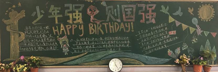 2018年10月8日至10月12日,结合“争做新时代好队员———集结在星星火炬旗帜下”的主题队日活动,我校举行了“中队板报寄真情,我对组织表挚心——祝福墙”绘制活动,各中队队员将教室后的大板报作为传递真情、表达挚心的载体,立足“我手绘我心”的目标,通过多彩的图案、多样的设计、多方面的文字内容融入对少先队这一光荣组织的炽烈情感。队员们在板报上介绍了少先队建纪念日的由来、红领巾的含义、星星火炬的含义、少先队队礼、少代会等少先队组织内容,借助手绘版的生日蛋糕、鲜花气球等鲜亮活泼充满童趣的图案传递少先队知识,营造少先队建队节快乐而温暖的氛围,真正做到发挥爱与想象力,自己用心、自己动脑、自己动手,布置属于自己的队集体,让队员们在队集体氛围中真正了解少先队、走近少先队,感受作为这一组织的一员所具备的组织光荣感和归属感,更好地传承红色基因。